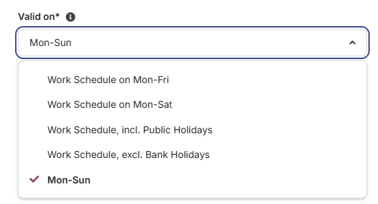 Ideally, we need it to work so that the “valid on” period is Monday–Sunday, excluding public holidays.
