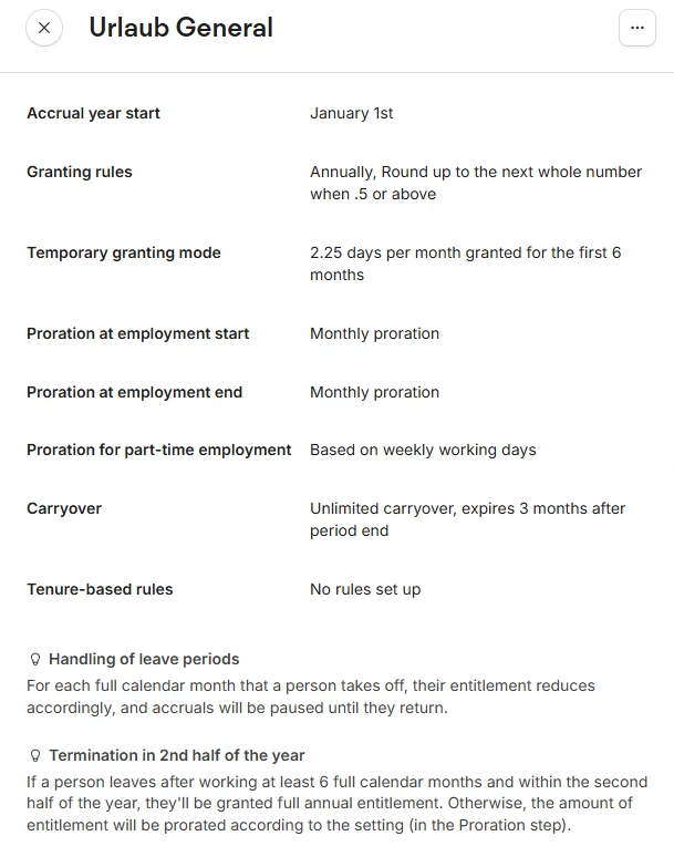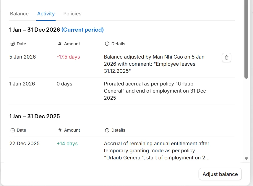 However, after 22 December 2025, Personio automatically grants new vacation days according to the time-off policy, even though the employee has already left the company and should no longer accrue any entitlement.